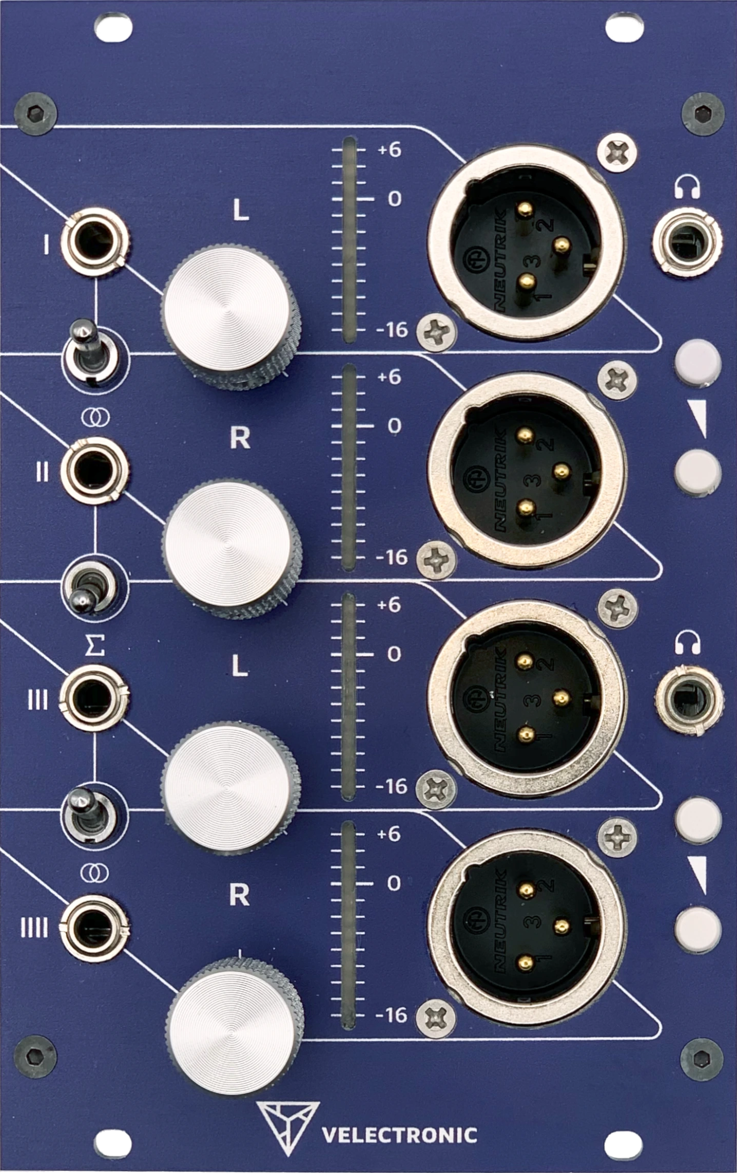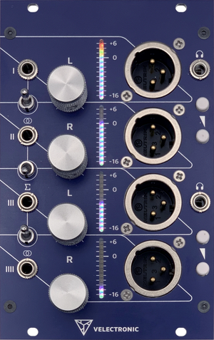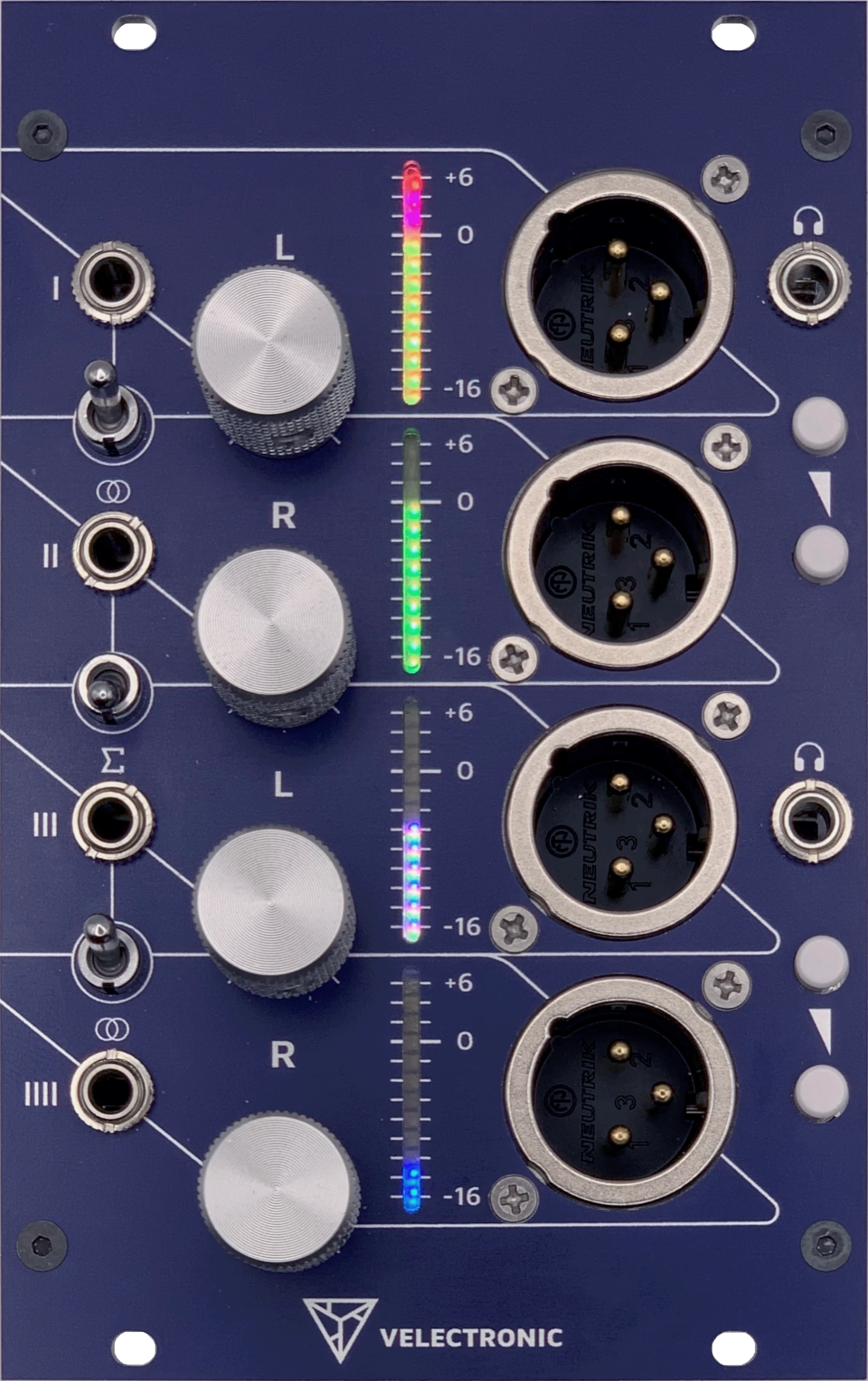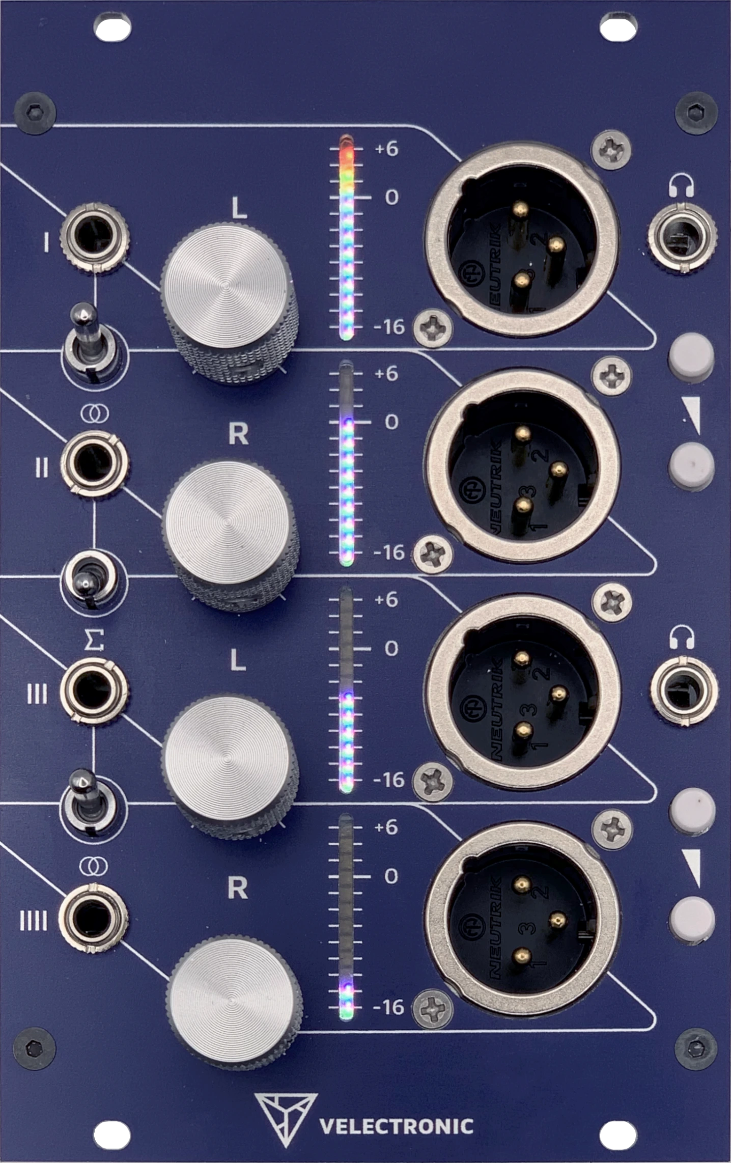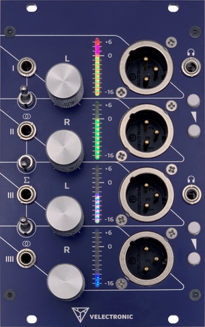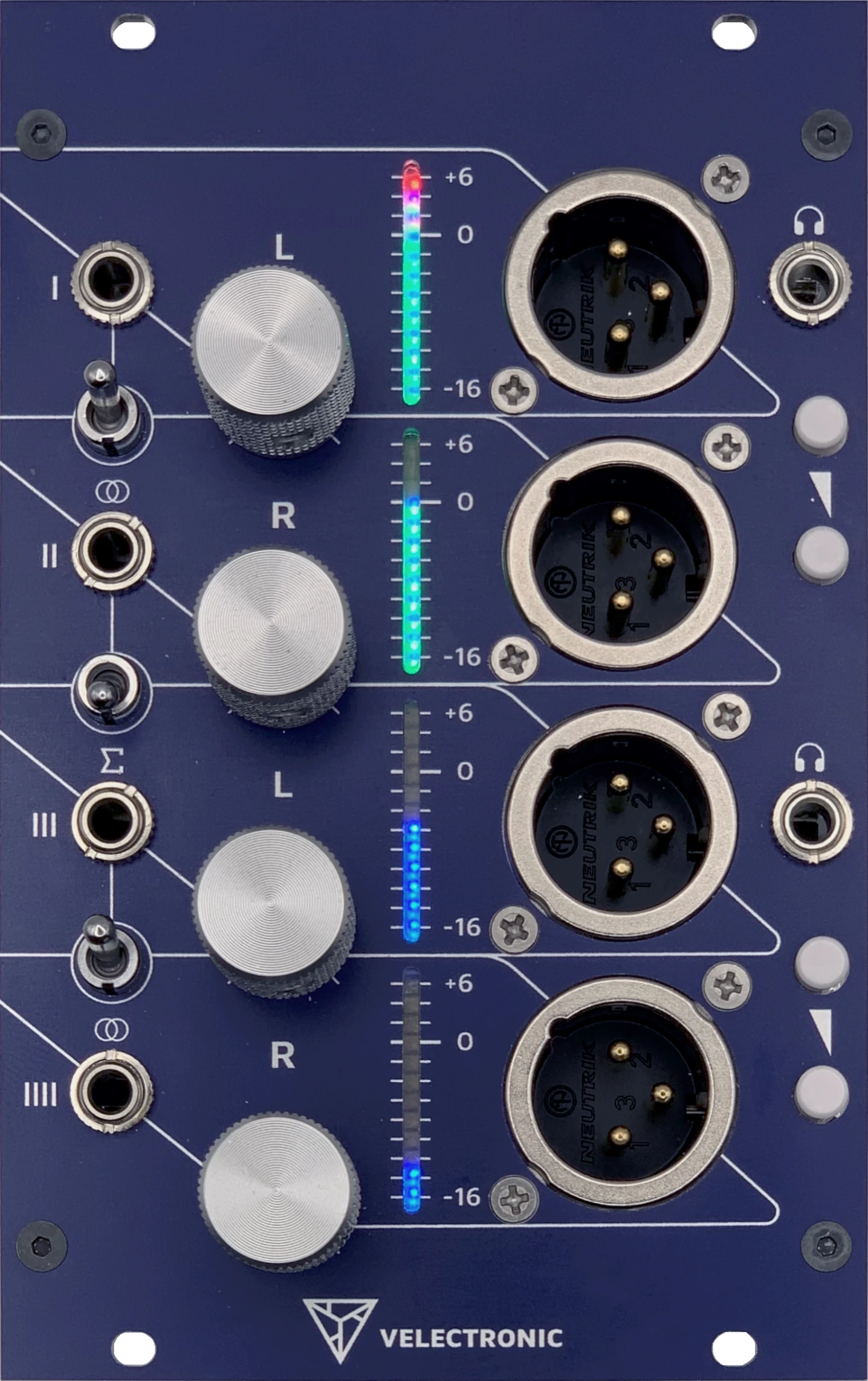 - Bipolar VU metering: Four independent 12-segment RGB LED bars monitoring both positive and negative signal cycles, from −16 dBu to +6 dBu.